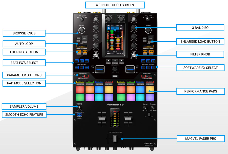 There is a noticeable difference in the look of the S11 to its predecessor the DJM-S9, along with the feel. This is down to some enhancements that have been made including larger performance pads, a strengthened Magvel Fader Pro which provides more stability when scratching and improved sound quality that produces powerful, clear audio. There are also some notable new features which included an industry first Smooth Echo and aforementioned world-first Deck 3/4 Control, which are further detailed below.